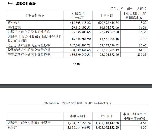 近日,宁波乐惠国际工程装备股份有限公司(以下简称“乐惠国际”、“公司”)发布2025年半年度报告。报告期内,公司实现营业收入61,550.84万元,较上年同期下降8.22%,公司实现归属上市公司净利润为2,563.64万元,较上年同期上升15.38%,公司净利润保持基本稳定。